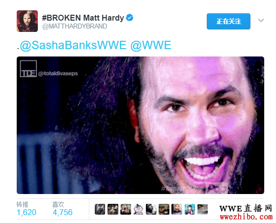 说道“Broken”这个词汇,怎么就和马特·哈迪扯上关系了。事情是这样的,马特·哈迪在将近一年里在TNA扮演的角色是“灵魂破碎(Broken)”的马特·哈迪,这个角色定位还要追索到当时他去年与弟弟杰夫·哈迪(Jeff Hardy)对战的时候呢。现在马特哈迪和杰夫·哈迪已经宣布与TNA分道扬镳了,加上莎夏·班克斯的推特消息,是否也在印证马特即将回归WWE呢?