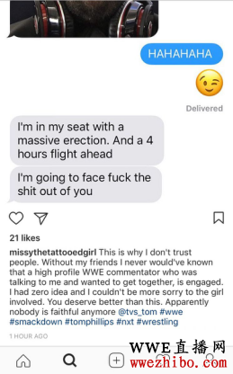 据说,WWE播报员汤姆·菲利普斯疑似在Instagram和推特上给女网友发下流信息。该消息一出,立即在网上炸开了锅,吃瓜群众立马站队展开骂战,有说炒作的,有说蹭热度的,有说衣冠禽兽的,众说纷纭。而事件女主角即该名女网友“missythetattooedgirl”在从朋友口中得知汤姆更是已经订婚的人后,决定将其下流信息公开。以下是涉事女主公开的聊天截图:
