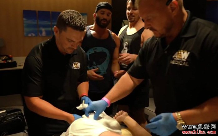 而今天AEW官方更是晒出了一份AEW医生为橘神缝针的视频,在视频中,橘神的面部被完全遮盖住了,由于拍摄角度独特,画面中并没有流血镜头,而AEW医生也在为橘神处理伤口,缝针!而一旁的最佳基友则在不断耍宝!